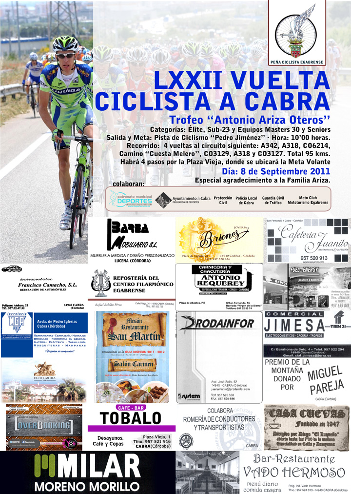 A primeras horas del próximo día 8 de Septiembre se pondrá en marcha en Cabra la tradicional vuelta cicilsta que cumple su 72 edición y que homenajea a uno de sus grandes artífices como fue Antonio Ariza Oteros.