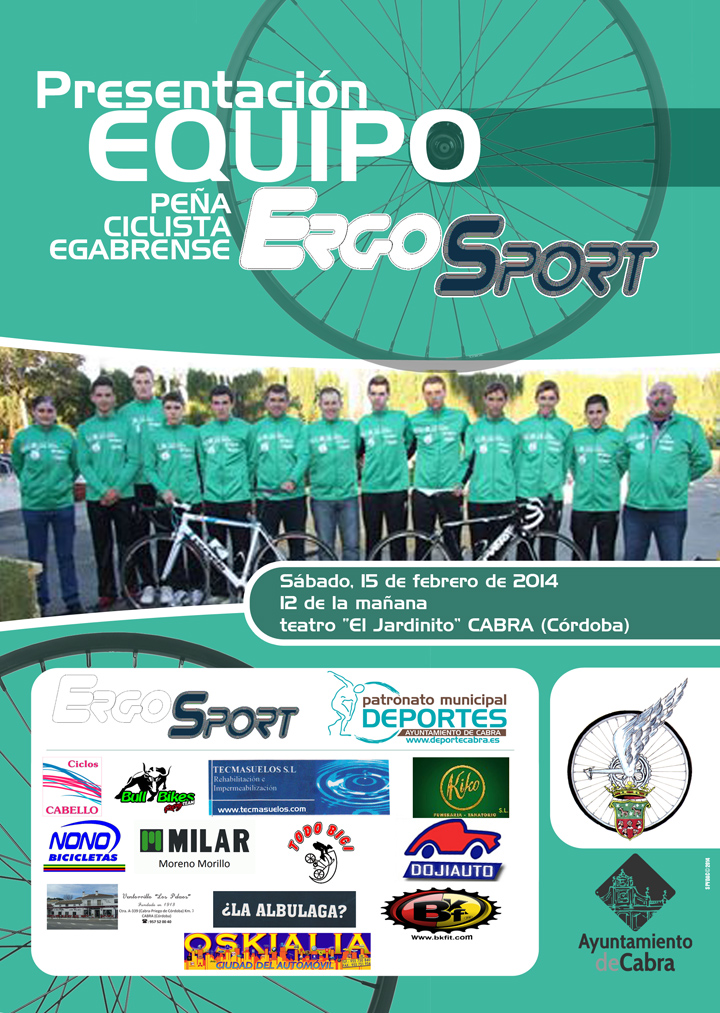 El próximo sábado día 15 de Febrero, se realizará a partir de las 12.00 horas, la Presentación oficial del Equipo de la Peña Ciclista Egabrense ErgoSport en el Teatro 'El Jardinito' de Cabra. Los componentes del Club, dirigidos por el Director Egabrense Joaquín León Rojas, tienen un calendario muy ilusionante y a la vez muy exigente donde deberán mostrar su buen nivel, sirviendo además de escaparate para temporadas sucesivas.