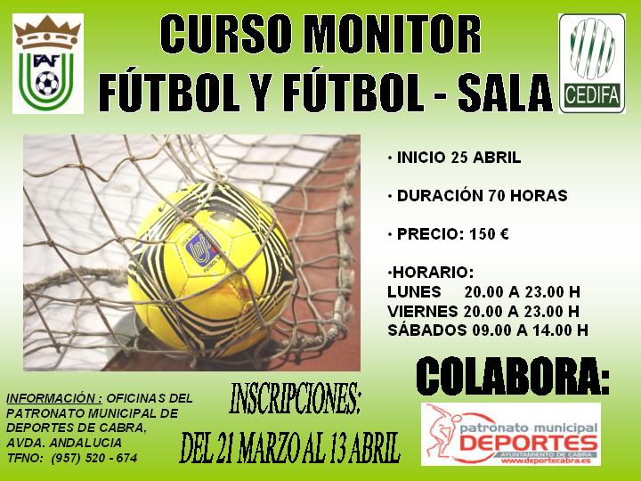 A partir del próximo lunes estará abierto el plazo para la inscripción en el Curso de Monitor de Fútbol y Fútbol Sala, que organiza la Federación Andaluza de Fútbol y el CEDIFA, y en el que colabora el Patronato Municipal de Deportes de Cabra, como sede del desarrollo del Curso.