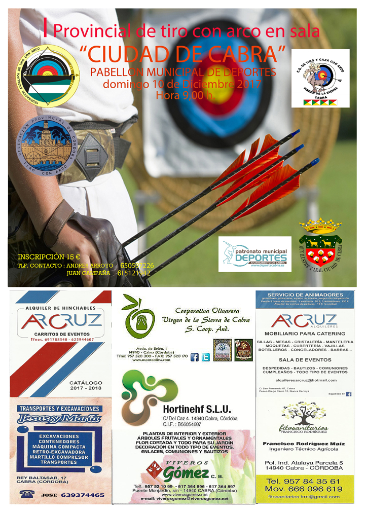 El tiro con Arco sigue acaparando mayor protagonismo a medida que los éxitos están llegando de la mano del Club de Tiro y Caza con Arco. Por ello el próximo domingo 10 de diciembre se va a celebrar en el Pabellón Municipal de Deportes de Cabra, el I Campeonato Provincial de Tiro con Arco en Sala, organizado por la Federación Andaluza de Tiro con arco y dicho Club Egabrense en colaboración con el Patronato Municipal de Deportes.