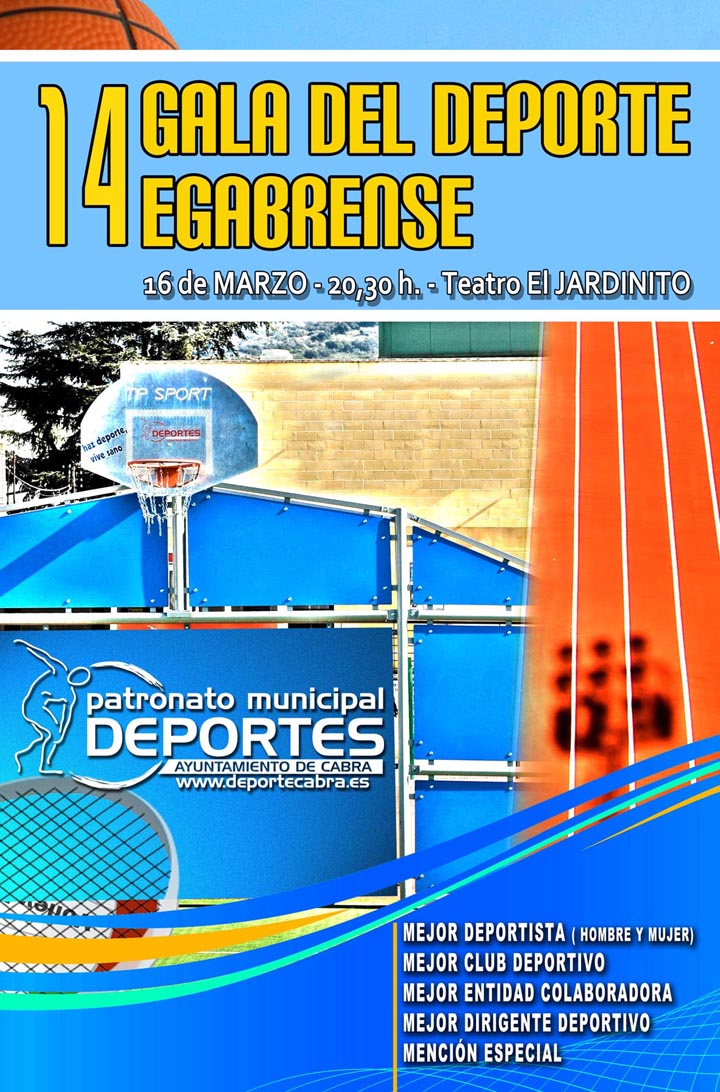 El próximo viernes día 16 de marzo, se celebrará en el Teatro 'El Jardinito' la XIV edición de la Gala del Deporte Egabrense. Una temporada más, los deportistas y entidades, más destacados volverá a ser homenajeados en la gran Fiesta del Deporte local, donde se reunirán directivos, familiares, amigos, representantes políticos y sobre todo los grandes protagonistas de este evento, que son los propios deportistas.