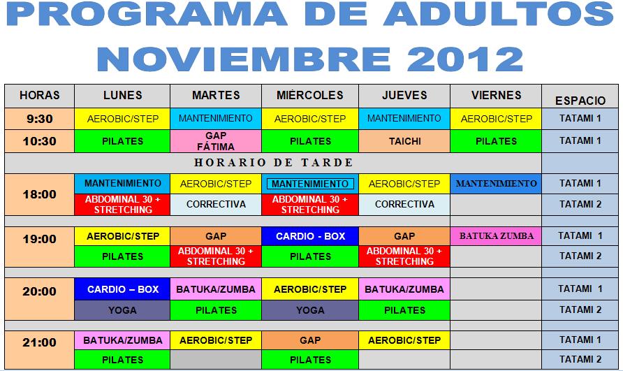 Desde el pasado día 9 de Noviembre,Programa de Adultos que coordina y desarrolla el Patronato Municipal de Deportes de Cabra, amplía su oferta deportiva a cinco tardes a la semana. Hasta el momento este atractivo Programa de Actividades contaba con cinco días a la semana en horario de mañana y cuatro días a la semana en el horario de tarde. La ampliación se llevará a cabo en las sesiones de 18.00 y 19.00 horas, y en ellas se impartirán dos de las modalidades que más aceptación tienen como son la Gimnasia de Mantenimiento y la Batuka-Zumba.