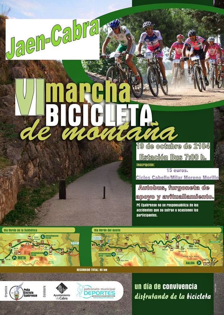 El próximo domingo, la Peña Ciclista Egabrense en colaboración con el Patronato Municipal de Deportes de Cabra, celebra la VI edición de la Marcha en BTT que llevará a los participantes desde Cabra hasta Jaén. La salida está prevista a las 07.00 h desde la Estación de Autobuses de Cabra. La inscripción de 15 euros se podrá realizar en Ciclos Cabello y en Milar Moreno Morillo.