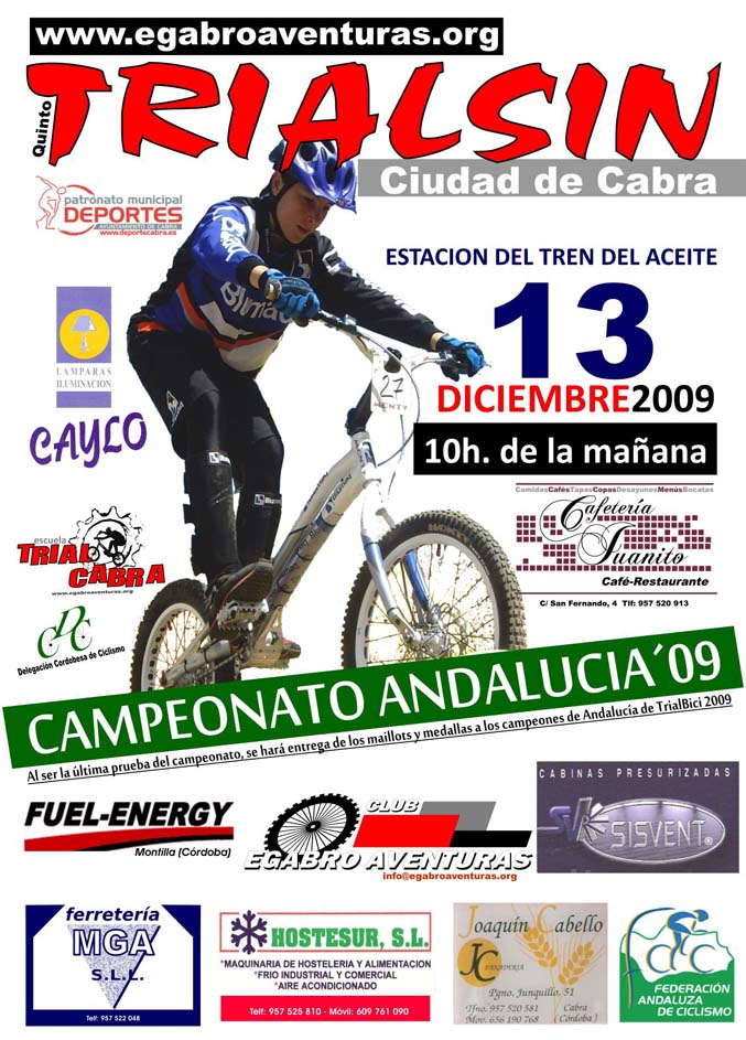 El próximo domingo 13 de diciembre se celebrará en nuestra Ciudad el V Trialsin de Cabra con la organización del Club Egabro Aventuras y la colaboración del Patronato de Deportes de Cabra así como distintas firmas comerciales.