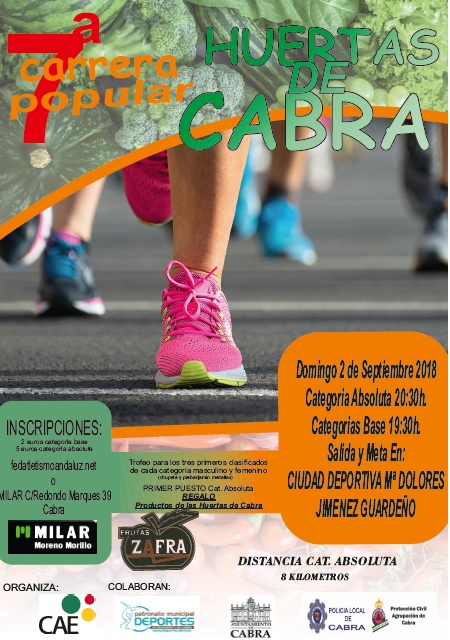 El próximo domingo día 2 de Septiembre a partir de las 20.30 horas en la Ciudad Deportiva Mª Dolores Jiménez de Cabra, y bajo la organización del Club de Atletismo Egabrense en colaboración con el Patronato de Deportes y Ayuntamiento de Cabra, se celebrará la 7ª edición de la Carrera Popular Huertas de Cabra.