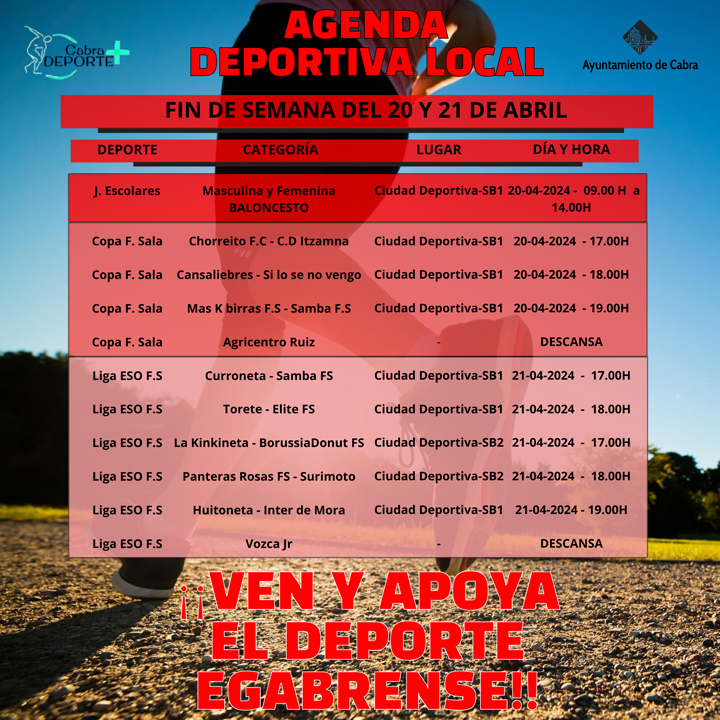 Además tendremos este fin de semana, el primer partido de Play-Off, por el Título Provincial de Baloncesto entre Cabra (Primero Liga Regular), y el Ciudad de Córdoba, que buscarán una plaza en semifinales, al mejor de tres encuentros. También los séniors de Fútbol Sala, Masculino y Femenino y el C. D. Egabrense, también disputarán sus encuentros en Cabra. Junto a ellos, las categorías de formación de Baloncesto y Fútbol nos ofrecerán encuentros con mucho en juego.