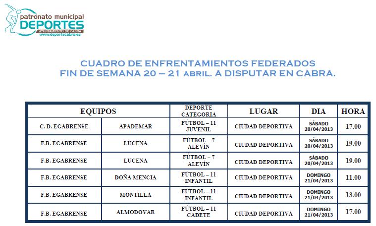 Un total de seis encuentros serán los que se disputen este próximo fin de semana en las instalaciones de la Ciudad Deportiva de Cabra. Con el Baloncesto y el Voleibol finalizado, será el Fútbol quien ocupe todo el protagonismo de la competición federada.