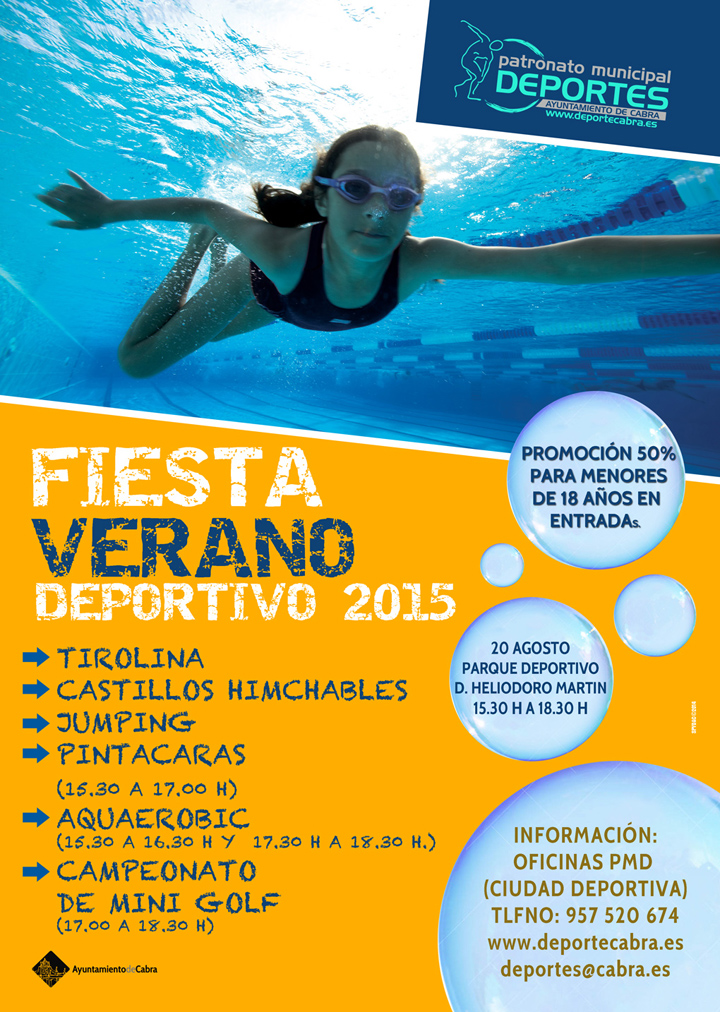 Las Piscinas del Parque Deportivo Heliodoro Martín encaran su recta final en cuanto a las actividades del verano 2015. Y lo hacen con una Fiesta Deportiva que se desarrollará el próximo jueves día 20 y en el que se reunirá los elementos de la aventura, diversión y el medio acuático. Para esta actividad organizada por el Patronato Municipal de Deportes, los menores tendrán una promoción en el precio de su entrada del 50 %.