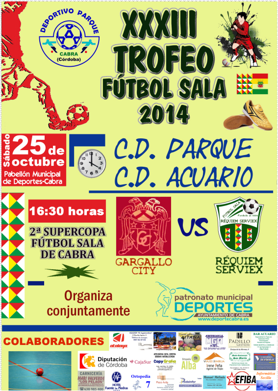 El C. D. Parque y el Patronato Municipal de Deportes de Cabra, organizan conjuntamente la II edición de la Supercopa. que en esta ocasión va a medir al Campeón de la Liga de Fútbol Sala, Gargallo City, con el Campeón de la Liga de Fútbol-7, Rekiem-Serviex. Dos equipos que sin duda van a ofrecernos un buen espectáculo previo al clásico de la Liga Española de Fútbol.