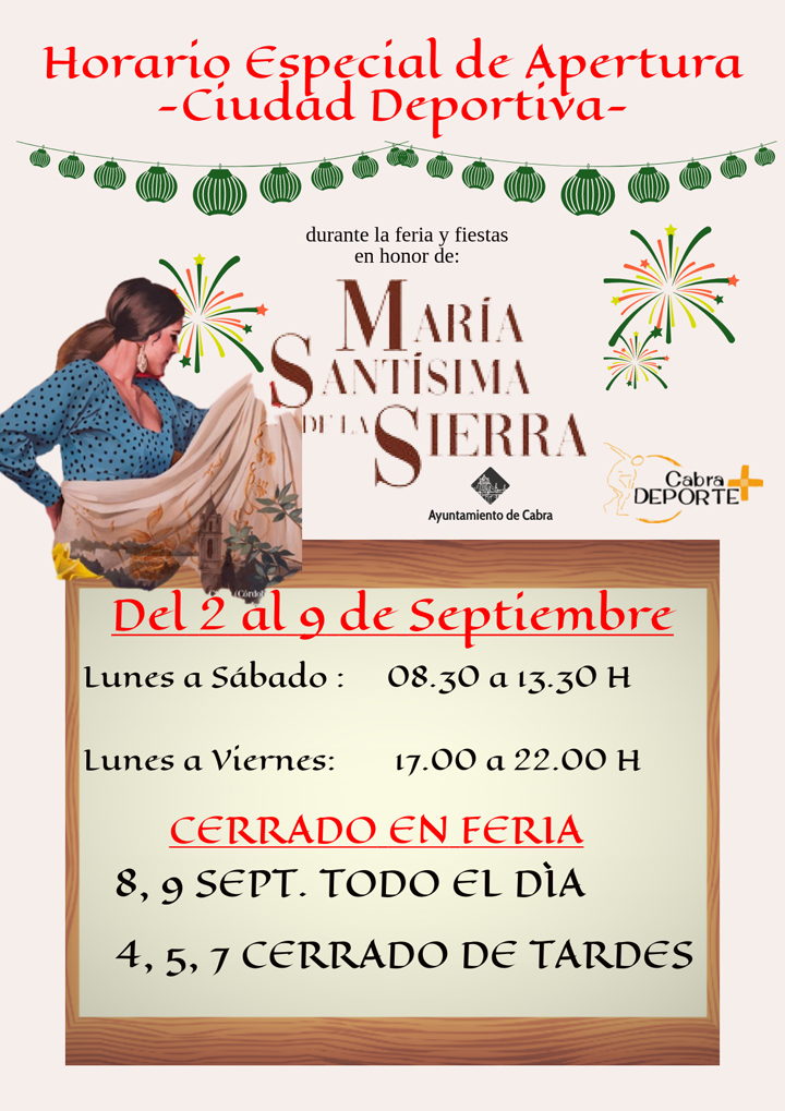 Llega el final de agosto y antes de regresar a las actividades del otoño e invierno, en nuestra Ciudad nos adentramos en una de las semanas más importantes. La Feria en Honor a nuestra Patrona volverá a traernos un gran número de actividades deportivas y para los que quieran alternar estas actividades con las suyas propias, os dejamos nuestros horarios en esta semana tan especial.