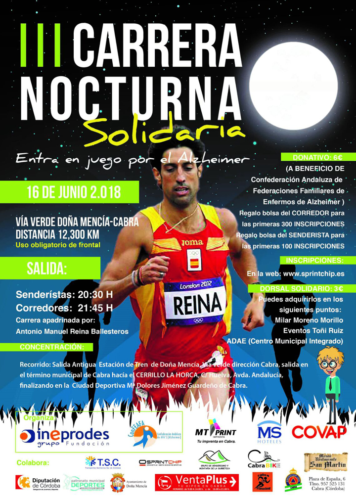 El próximo día 16 de Junio se celebrará la III Carrera Popular Solidaria - Entra en juego por el Alzheimer -, que volverá a unir por medio de sus participantes, las localidades de Doña Mencía y Cabra con un recorrido de 16 kilómetros. La salida de los senderistas está prevista para las 20.30 horas mientras que los corredores lo harán a las 21.45