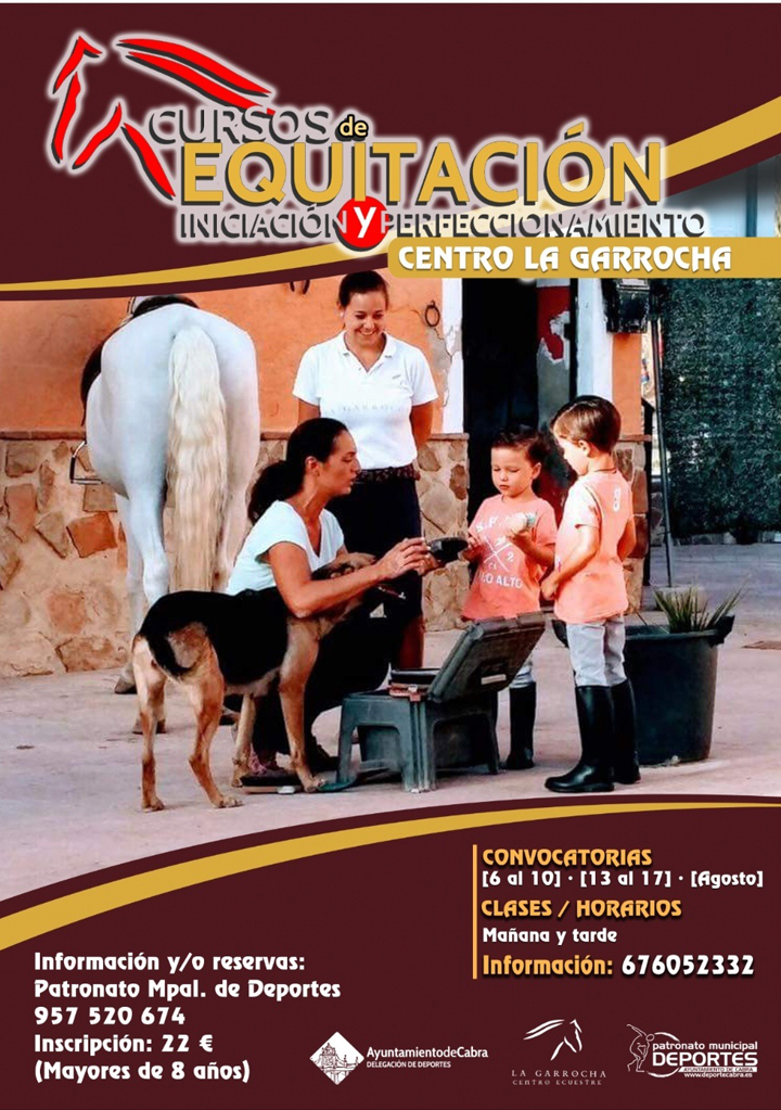 Nuevamente regresan los Cursos de Equitación en el Centro La Garrocha, organizado por dicho Centro en colaboración con el Patronato Municipal de Deportes de Cabra. Las convocatorias están previstas para las dos próximas semanas de Agosto y la inscripción se puede realizar en las oficinas del Patronato Municipal de Deportes.