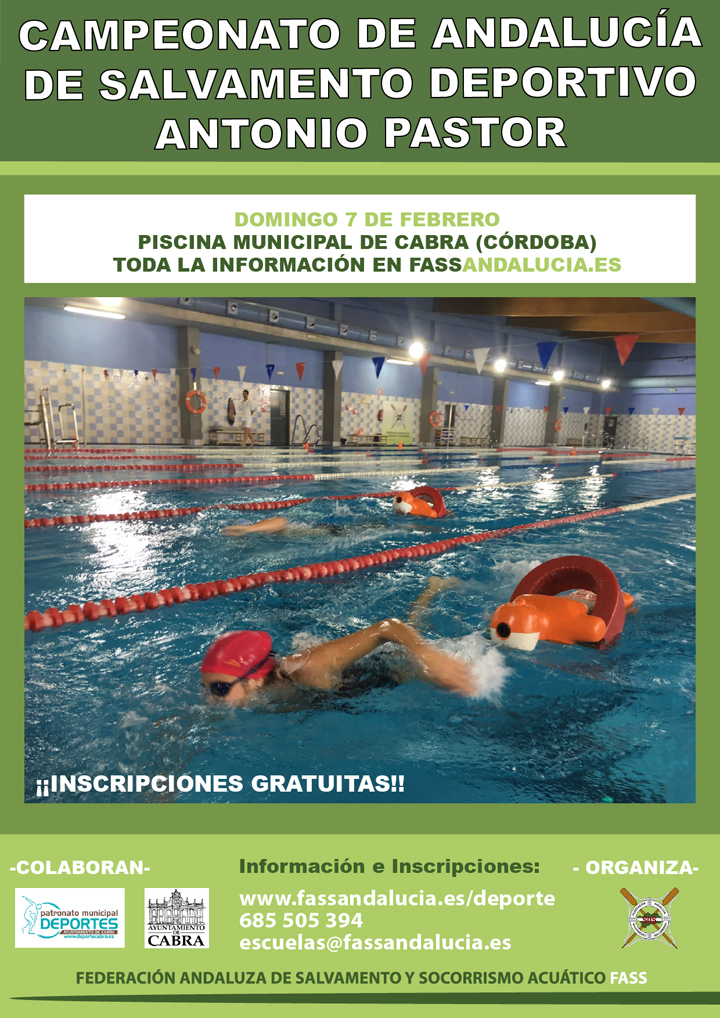 El próximo domingo día 7 de Febrero las instalaciones de la Piscina Climatizada de Cabra acogerán el Campeonato de Andalucía de Salvamento Deportivo que organiza la Federación Andaluza de Salvamento y Socorrismo en colaboración con el Patronato Municipal de Deportes de Cabra y el Iltmo. Ayuntamiento de Cabra.
