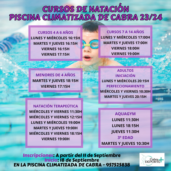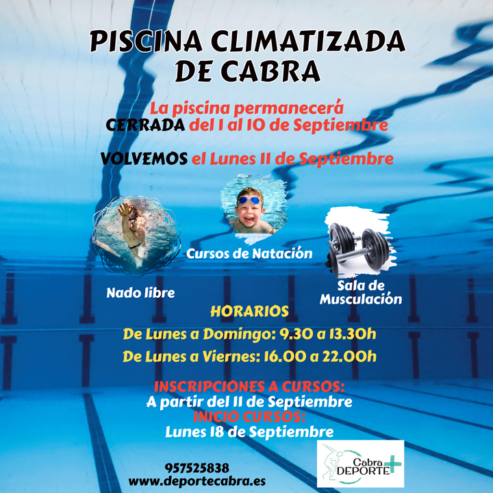 Estamos en los últimos días del verano, pero en Cabra nuestras actividades acuáticas no finalizan en todo el año. La piscina climatizada descansará en estos primeros días de Septiembre para poner a punto todas sus instalaciones, y volverá a abrir sus puertas el próximo día 11.
