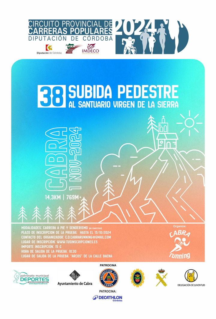 Pocas pruebas populares son más veteranas que la Subida al Santuario de la Virgen de la Sierra en Cabra. La Subida del 1 de noviembre, como también se la conoce cumple este año su trigésimo octava edición, organizada por el Club Deportivo CabraRunnig y en colaboración con el Patronato Municipal de Deportes del Ayuntamiento de Cabra.