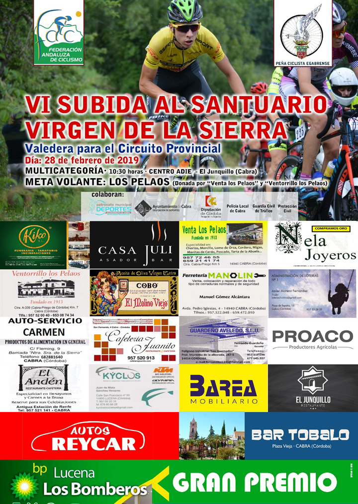 Todo un clásico del ciclismo en Bicicleta de montaña, llega puntual a su cita de cada mes de Febrero. La Peña Ciclista Egabrense, en colaboración con la Federación Andaluza de Ciclismo y el Patronato Municipal de Deportes de Cabra, organizan la VI Subida al Santuario de la Virgen de la Sierra el próximo jueves 28 de Febrero, festividad del día de Andalucía.