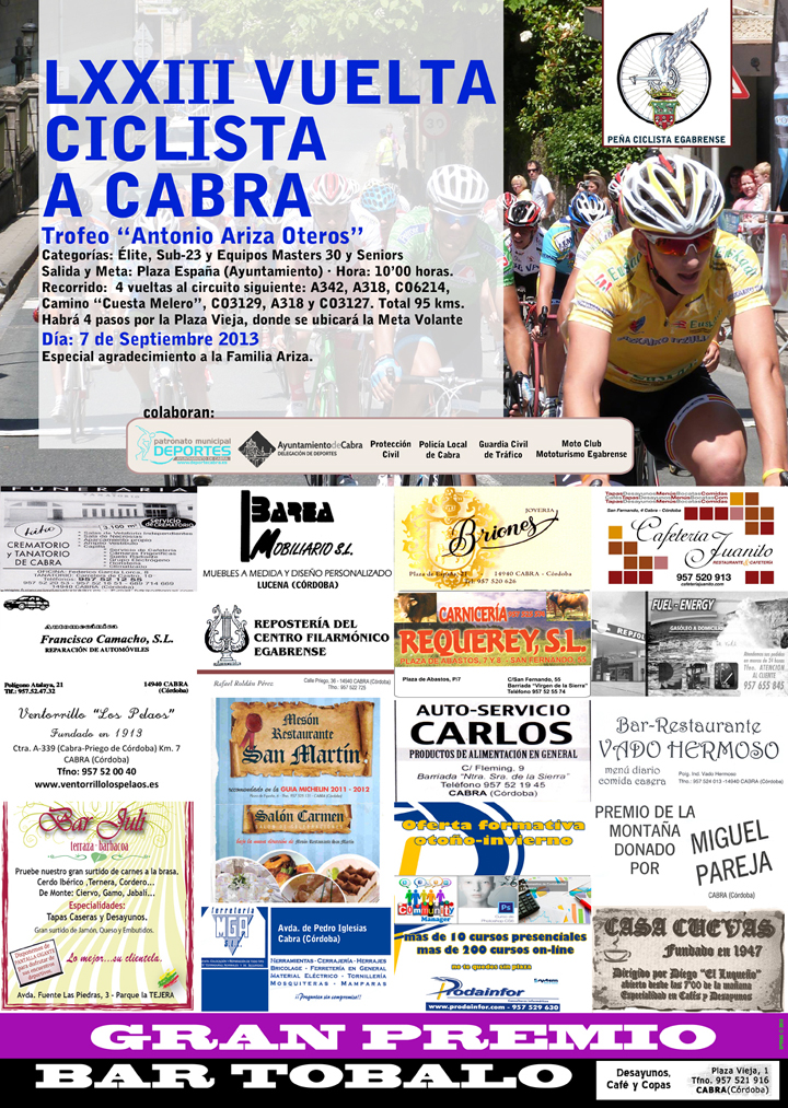 Sin duda la Vuelta a Cabra 'Trofeo Antonio Ariza Oteros' es una de las pruebas deportivas más antiguas y con más solera de cuantas se celebran en nuestra Ciudad. Organizada una vez más por la Peña Ciclista Egabrense en colaboración con el Patronato Municipal de Deportes de Cabra, se celebrará el próximo día 7 a partir de las 10.00 horas