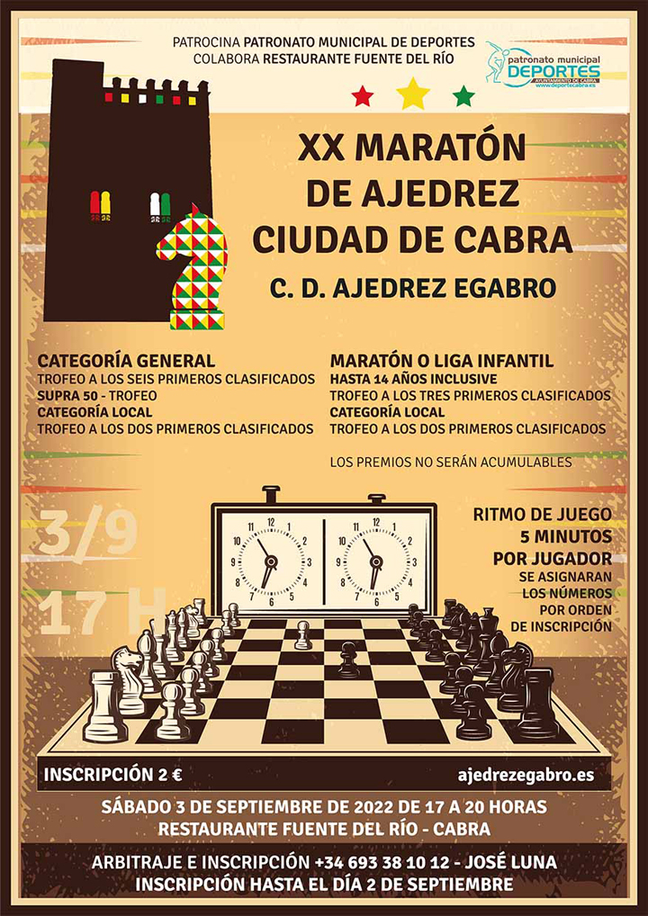 En los días previos al inicio de las Fiestas de Septiembre, se hace pública la cartelería de las actividades deportivas que se van a celebrar con motivo de las Fiestas en Honor a la Patrona de Cabra y que ocupan un apartado muy destacado dentro de los actos programados. Una de las actividades que no suele faltar es el tradicional Torneo de Ajedrez que en este año cumple su vigésima edición.