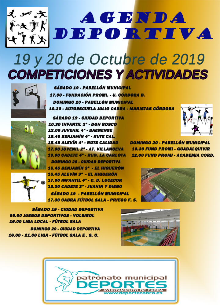 Se nos presenta un fin de semana repleto de acontecimientos deportivos, y eso que la campaña de actividades y competiciones no ha hecho más que empezar. La variedad deportiva y el enorme seguimiento que tiene nuestra Ciudad en torno al deporte, hace que cada semana, las instalaciones que se coordinan desde el Patronato Municipal de Deportes, cuenten con una acogida sin precedentes.