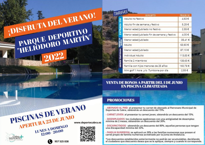 El próximo 23 de junio volverán a abrir sus puertas las instalaciones del Parque Deportivo -Heliodoro Martín - devolviéndole a las instalaciones el brillo que le da el público asistente cada día hasta el cierre, que está previsto el 31 de Agosto. De 12.00 a 20.00 horas permanecerá diariamente abierto el recinto deportivo, de lunes a domingo.