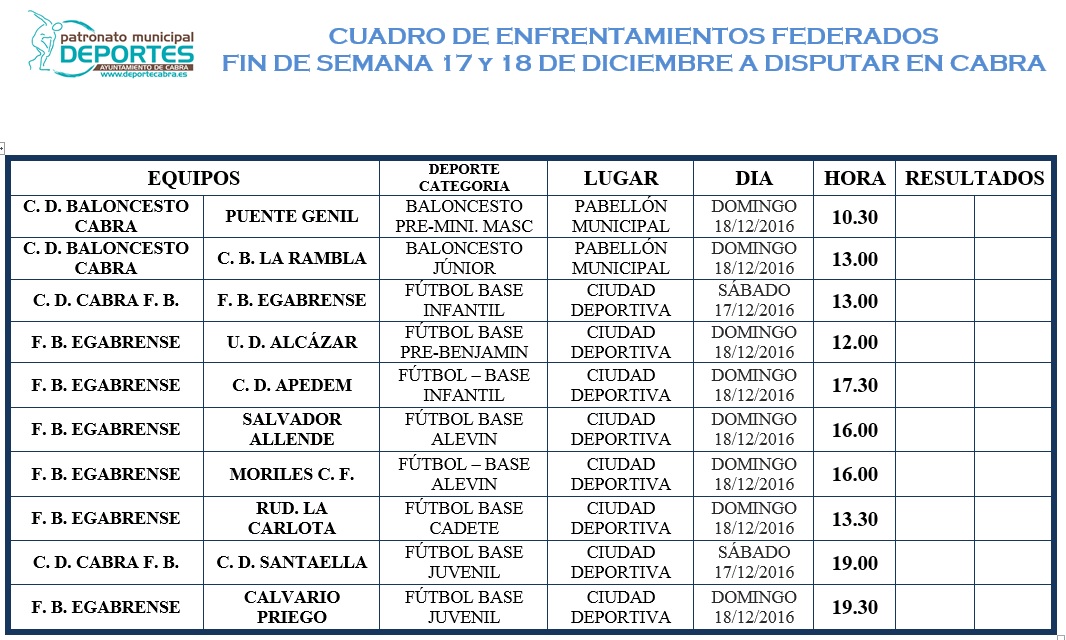Estas fechas muy propicias para Torneos amistosos y solidarios, servirán para no desconectar completamente de la competición, que regresará una vez pases las Fiestas Navideñas. Sólo dos encuentros de Baloncesto, rompen la hegemonía del Fútbol Base, que una semana más ocupa la mayor parte de las horas.