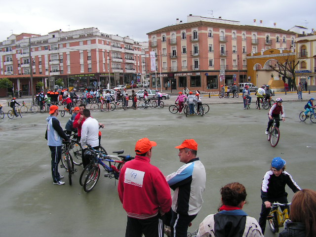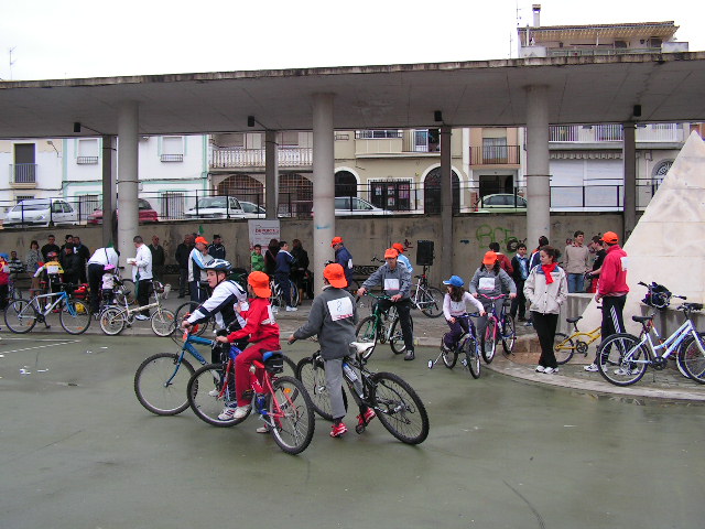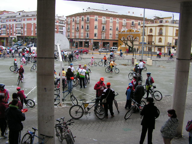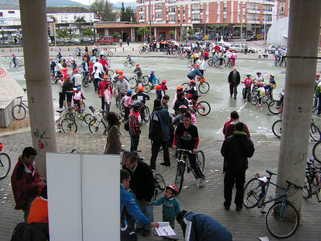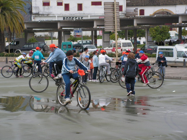 Mañana desapacible la que se presentaba en el Día de Andalucía, pero también con muchas ganas de celebrar el Día de la Bicicleta, como así lo mostraban el medio centenar de participantes que se concentraban en la Pérgola de la Tejera, hora y media antes del inicio de la actividad. Las inscripciones se realizaron sin novedad, y tan sólo cinco minutos antes de la salida las primerass gotas de agua aparecían en nuestra Ciudad, cuando los más de doscientos quince inscritos se encontaban en la zona de salida. Las peticiones de los participantes en dar la salida hizo que pasados unos minutos de la hora señalada se diera la salida a todo el grupo, que tardó algo menos de 30 minutos en completar el recorrido, donde la persistencia de la lluvia impidió que se llevaran a cabo las exhibiciones previstas, así como el resto de las actividades. Eso sí bajo la lluvia y ayudados por los paraguas, se procedió a la inauguración por parte de la Alcaldesa, Mª Dolores Villatoro y el primeer Teniente de Alcalde, Manuel Carnerero, de la zona de juegos en el Tren del Aceite, así como al sorteo de las Bicicletas.