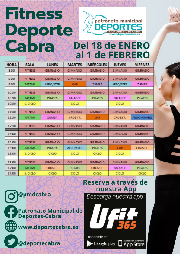 De acuerdo a la última modificación establecida por la Junta de Andalucía, estos son los horarios de nuestro programa Fitness Deporte Cabra adaptados a dicha modificación.