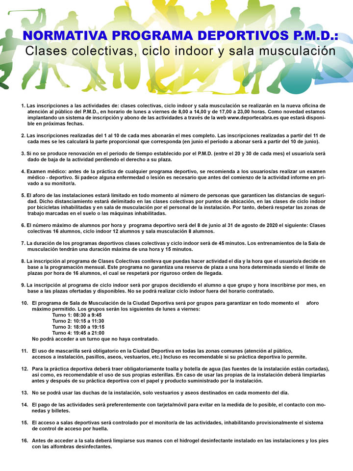 Cada deportista podrá inscribirse al curso que desee, siempre que cuente con plaza libre, y además tendrá que adaptarse a ese grupo. Las sesiones serán de 45 minutos y se suprime la sesión posterior a la clase en la que se trabajaban varios aspectos físicos. Cada alumno/a contará en su horario con la bicicleta acondicionada así como todo lo que necesite para la desinfección previa a su utilización.