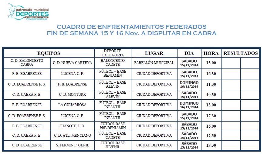Se nos presenta un fin de semana algo menos cargado de encuentros federados que el anterior. Aún así tendremos un buen número de partidos, que nos harán disfrutar del deporte de base de nuestra Ciudad. En especial es el fútbol base el gran protagonista de este fin de semana, ya que salvo el encuentro de categoría cadete de Baloncesto, el resto se lo reparten entre los dos clubes de fútbol base de Cabra.