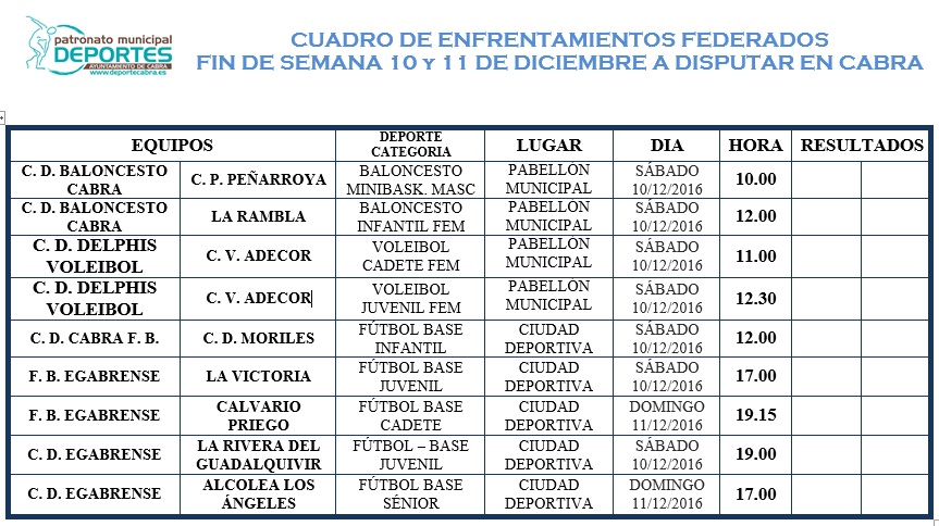 Además de los encuentros que se reflejan en este cuadrante, esta semana también destaca la Presentación Oficial de los equipos del Club D. Baloncesto Cabra, que se realizará el sábado por la tarde en el Pabellón Municipal.