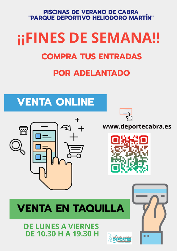 Dentro de la web del Patronato Municipal de Deportes de Cabra, www.deportecabra.es, en el apartado "VENTA ENTRADA PISCINAS" podrás adquirir tus entradas para los días que consideres oportuno y de esta forma garantizar tu entrada a las piscinas de verano.