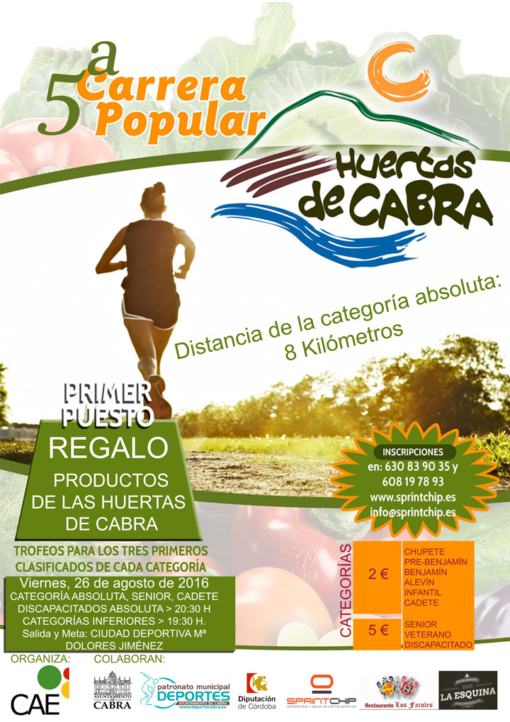 El próximo día 26 Agosto se celebrará la 5ª edición de la Carrera Popular Huertas de Cabra. Una prueba que cada temporada aumenta en prestigio, dado su buen nivel organizativo, la belleza de su recorrido y también la riqueza natural con la que se premia a los ganadores. En esta edición, la salida y llegada será en la Ciudad Deportiva Mª Dolores Jiménez Guardeño de Cabra.