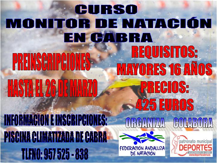 La Federación Andaluza de Natación, vuelve a poner sus ojos en nuestra Ciudad con la intención de organizar un Curso de Monitor de Natación, que continue con la formación de los deportistas de nuestra Ciudad y de la Comarca. El Patronato Municipal de Deportes que actúa de colaborador en este Curso, sigue poniendo el máximo empeño en que los egabrenses no tengan que desplazarse a muchos kilómetros de nuestra zona para poder adquirir los conocimientos necesarios de cara a desempeñar una importante labor en un puesto de trabajo. Por suerte en nuestra Ciudad hay trabajo durante todo el año para los Monitores de Natación, que en mayor o menor medida dependerá del número de Cursos de Natación que estén habilitados para ofrecer trabajo a quienes posean esta titulación.
