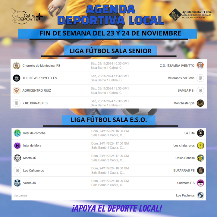 En esta información te presentamos tanto las competiciones deportivas locales que se están desarrollando desde el Patronato Municipal de Deportes, Liga de Fútbol Sala de categoría absoluta y de alumnos de los Institutos de Secundaria, como los horarios de los Juegos Escolares.