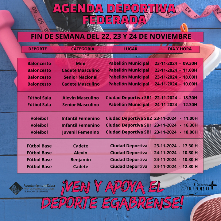 Si te gusta el deporte, si lo practicas con frecuencia o simplemente tienes a alguien cercano que va a participar en alguna competición, no te pierdas nuestra agenda porque tendrás información detallada de horarios e instalaciones donde podrás pasar gran parte de tu tiempo en el fin de semana.