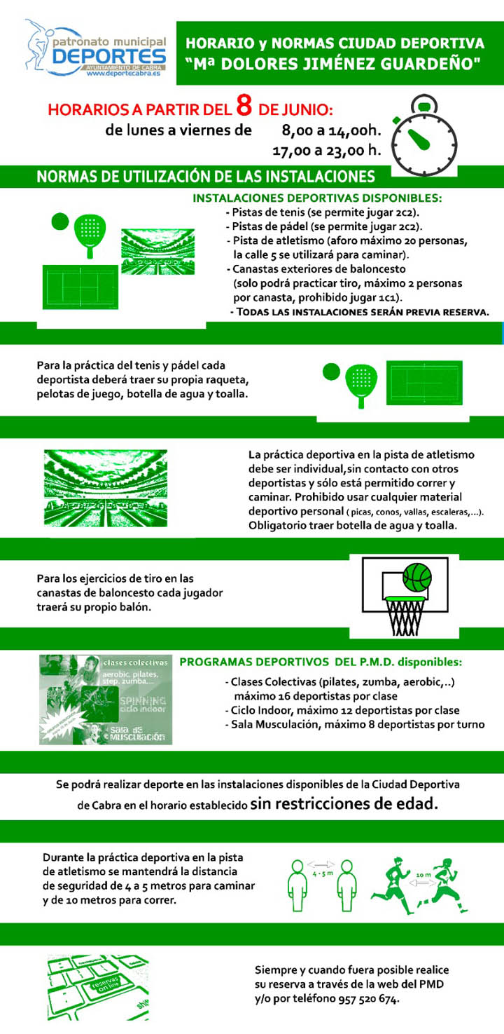Junto a las actividades descritas en nuestro Cartel principal, se ampliarán algunas de las actividades que se realizan en pista exterior. Desde el lunes se podrá jugar pádel y tenis con el sistema de dobles, así como las canastas exteriores, podrán ser utilizadas por dos jugadores por canasta, pero aún sólo con ejercicios de tiro.