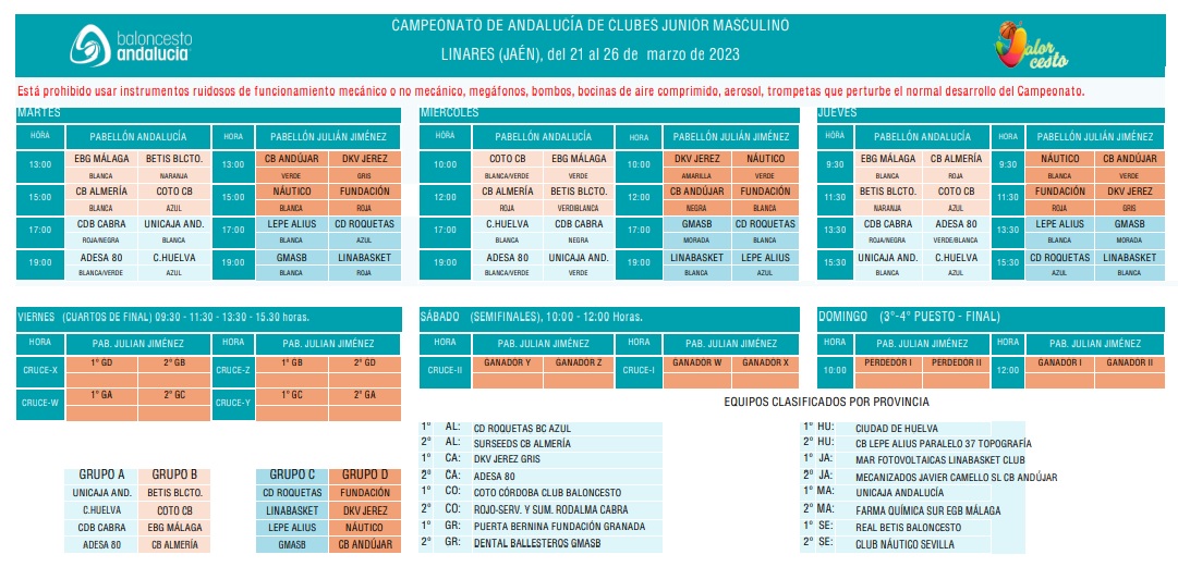 El Campeonato se pone en marcha mañana martes y los 16 participantes han quedado encuadrados en cuatro grupos de cuatro equipos cada uno, teniendo una primera fase regular que se disputará entre el martes y el jueves. para disputar los cuartos de final el viernes, las semifinales el sábado y la final el domingo próximo. El equipo de Cabra ha quedado encuadrado en un grupo muy complicado con Unicaja, Huelva y Sanlúcar, siendo éste el orden de enfrentamientos.