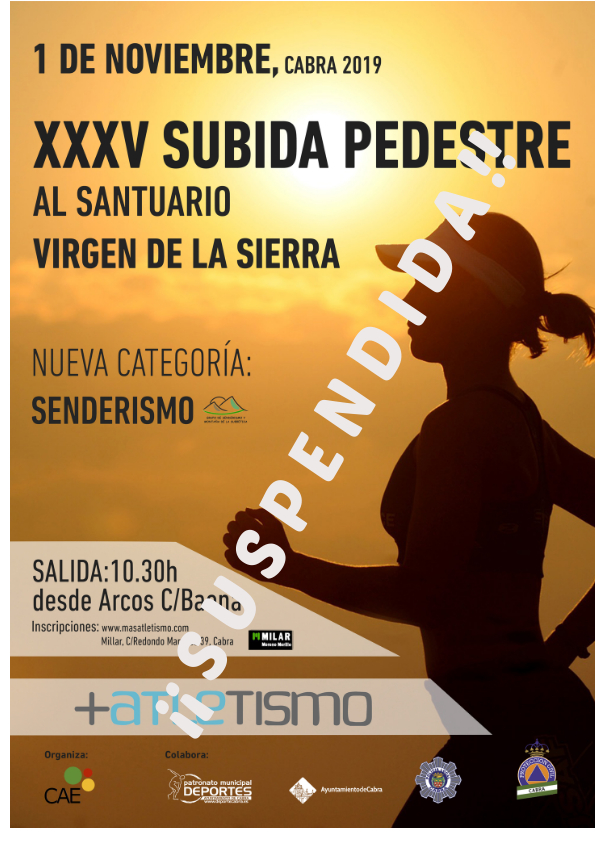 El Patronato Municipal de Deportes del Ilmo. Ayuntamiento de Cabra comunica que la presente edición de la carrera al Santuario de la Virgen de la Sierra queda suspendida este año 2021. Sin embargo ya se está trabajando para que en próximas ediciones, esta fiesta del atletismo popular se vuelva a vivir por nuestras calles.