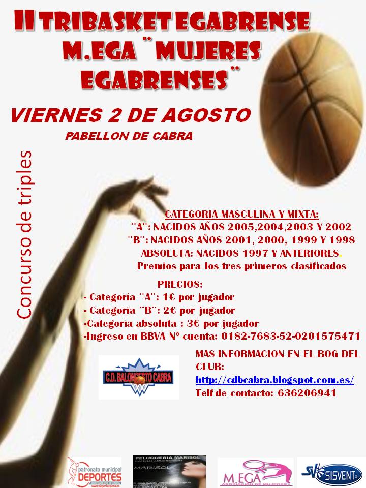 El viernes 2 de agosto en horario de 17,00 a 24,00 horas se va a llevar a cabo en el Pabellón Municipal de Deportes de Cabra el II TRIBASKET EGABRENSE M.EGA "MUJERES EGABRENSES", torneo que organiza el C.D. BALONCESTO CABRA junto con la colaboración del PATRONATO MUNICIPAL DE DEPORTES DE CABRA y M.EGA ASOCIACIÓN DE MUJERES EGABRENSES.