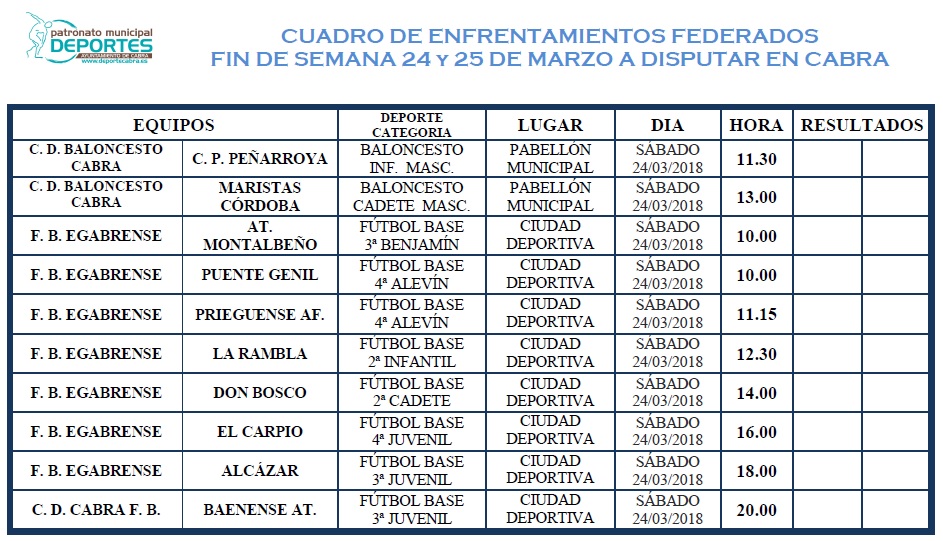 Jornada intensa la que nos ofrece el sábado día 24, en lo que corresponde al fin de semana donde por motivos obvios no se celebran encuentros deportivos federados en nuestra Ciudad. Hasta 10 encuentros se repartirán en las instalaciones deportivas sumándose a otras actividades que también disputarán su jornada previa al descanso por Semana Santa.