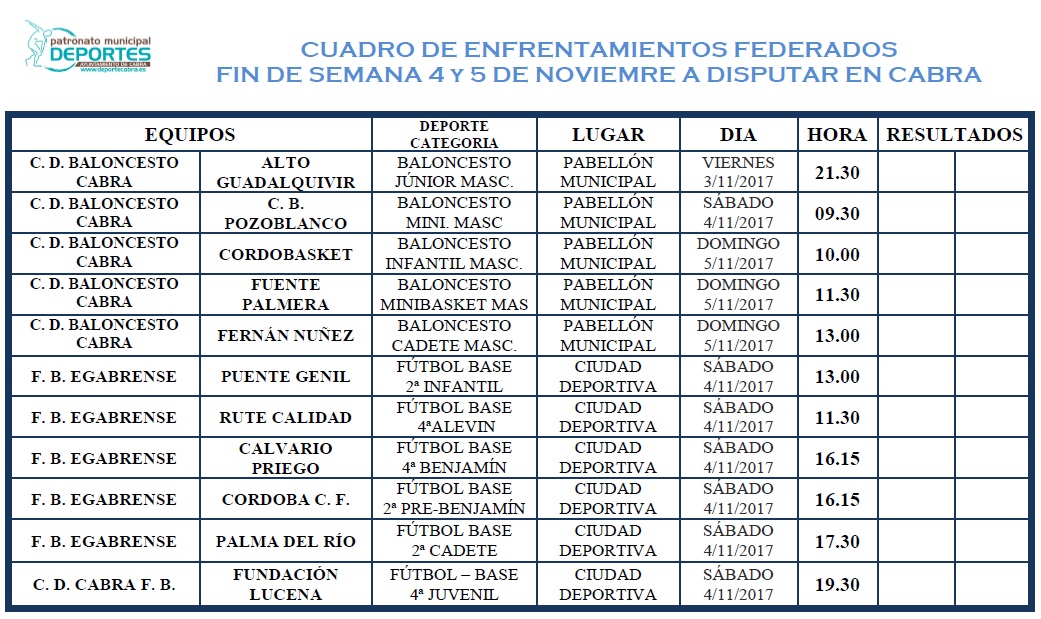 En el apartado de DESCARGAS os dejamos el cuadrante de horarios de partidos federados.