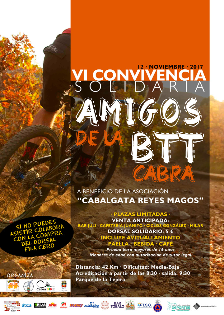 El próximo domingo 12 de Noviembre se celebrará la VI edición de la Convivencia de los Amigos de la BTT de Cabra, donde una vez más se realiza a Beneficio de la Cabalgata de los Reyes Magos. En esta ocasión la prueba tendrá un recorrido total de 42 Km, con un nivel de Dificultad Medio-Bajo, por lo que dicha prueba será apta para todos los aficionados mayores de 16 años y aquellos menores que lleven autorización del Tutor/a.