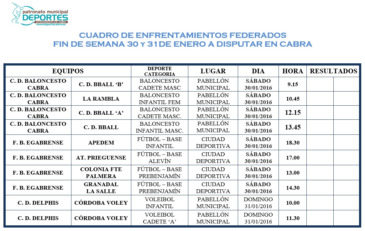 Fin de semana con interesantes enfrentamientos federados los que se van a poder presenciar en las instalaciones municipales. En Baloncesto el equipo cadete A de Cabra, actual líder, recibe al segundo clasificado de la competición, en un partido que puede dejar sentenciados los puestos de cabeza en la fase regular. Por su parte el Club de Voley, recibe a uno de los equipos de la capital con mayor potencial y donde se puede ver el buen nivel de las jugadoras de Cabra.