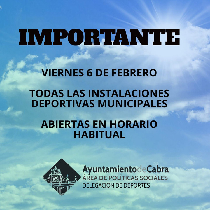 Desde la Delegación de Deportes del Ayuntamiento de Cabra, queremos informar que para este próximo fin de semana 7 y 8 de febrero, las competiciones locales, Juegos Escolares y Ligas de Fútbol Sala, quedan aplazadas debido a las inclemencias meteorológicas que informan que ambos días pueden volver a ser de lluvia intensa.