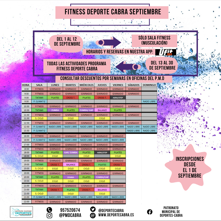 Desde el día 1 de Septiembre se pondrá en marcha parte del Programa Fitness Deporte Cabra, que organiza y desarrolla el Patronato Municipal de Deportes de Cabra, concretamente, será la Sala de Musculación, la que no descanse en este inicio del próximo mes. La Sala de Fitness y el Ciclo Indoor retomarán su actividad a partir del día 13 de Septiembre.